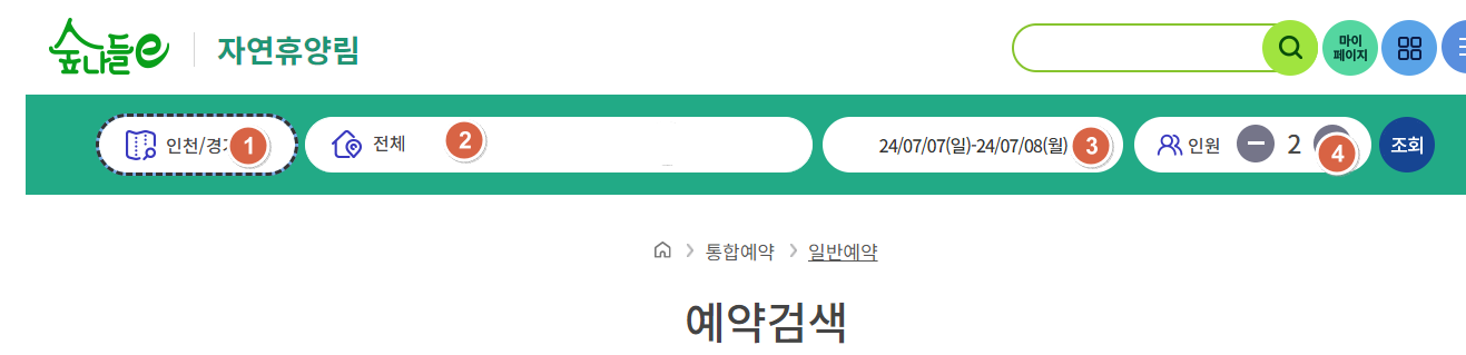 - 자연휴양림 메인 페이제에서 우선예약, 일반예약을 클릭하고 원하는 지역, 휴양림 시설 선택, 날짜 인원