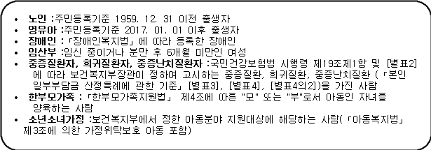 · 「국민기초생활보장법」에 의한 기초생활수급 세대 중 등유 또는 LPG 보일러를 주 난방수단으로 사용하는 세대(주민등록표 등본상 세대 기준)