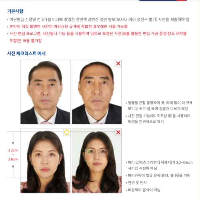 ㅇ여권사진규격에부합하지않는경우심사과정에서여권접수가반려되거나여권교부가거부될수있습니다.