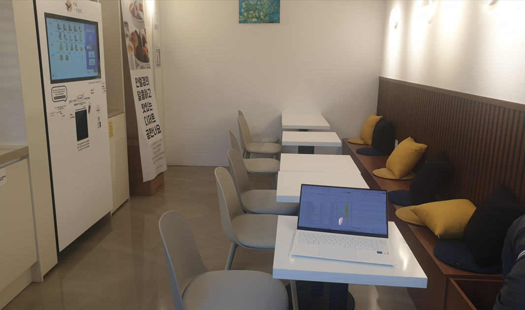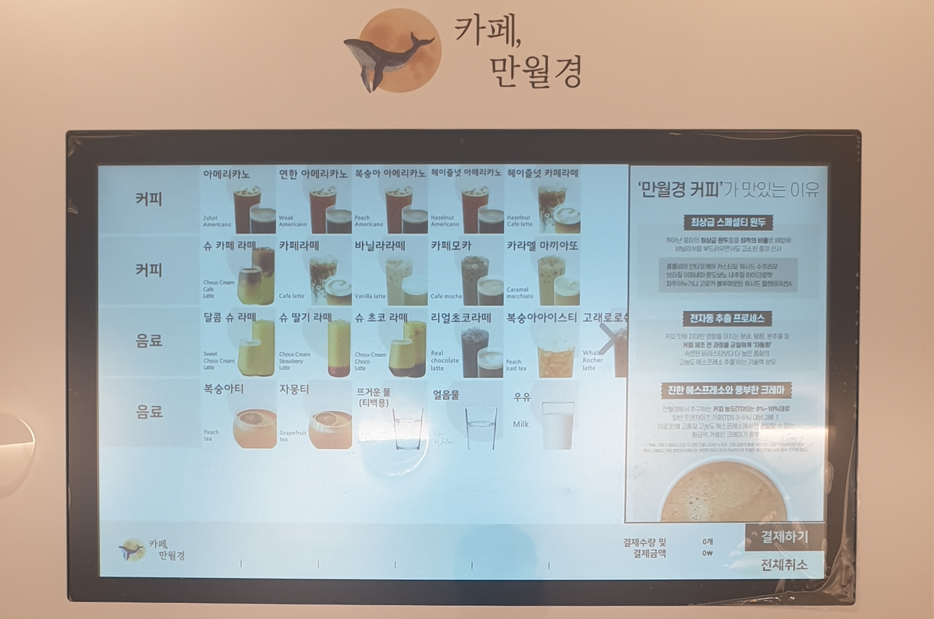 커피나 음료를 주문 하는 것은 보시는 화면에서 선택을 하고 결제는 시스템입니다. 즉 무인 카페입니다.