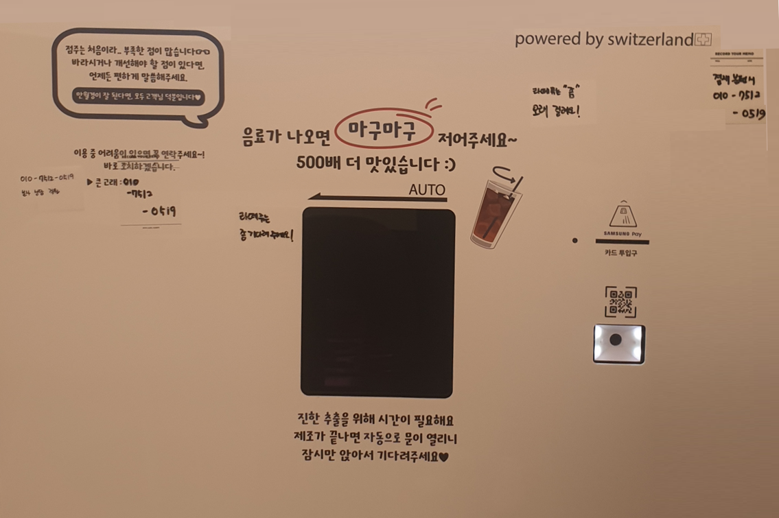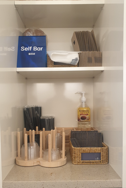 머신에서 각종 음료르 제공합니다. 자신에게 피료하게 하는 셀프바입니다