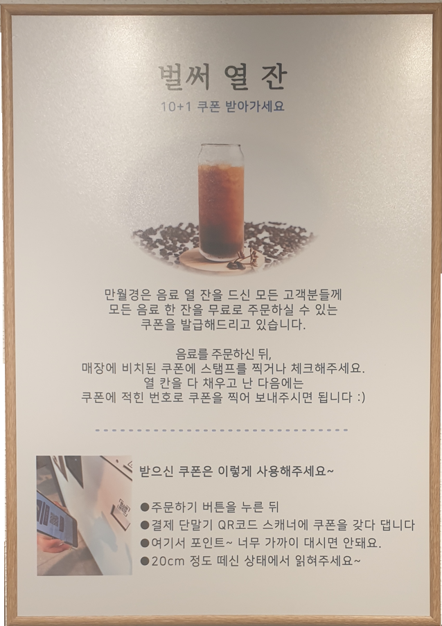 보시는 것처럼 열잔을 사면 한잔을 더 주는 시스템입니다. 열잔 증명서 스템프는 바로 비치되어 있습니다.